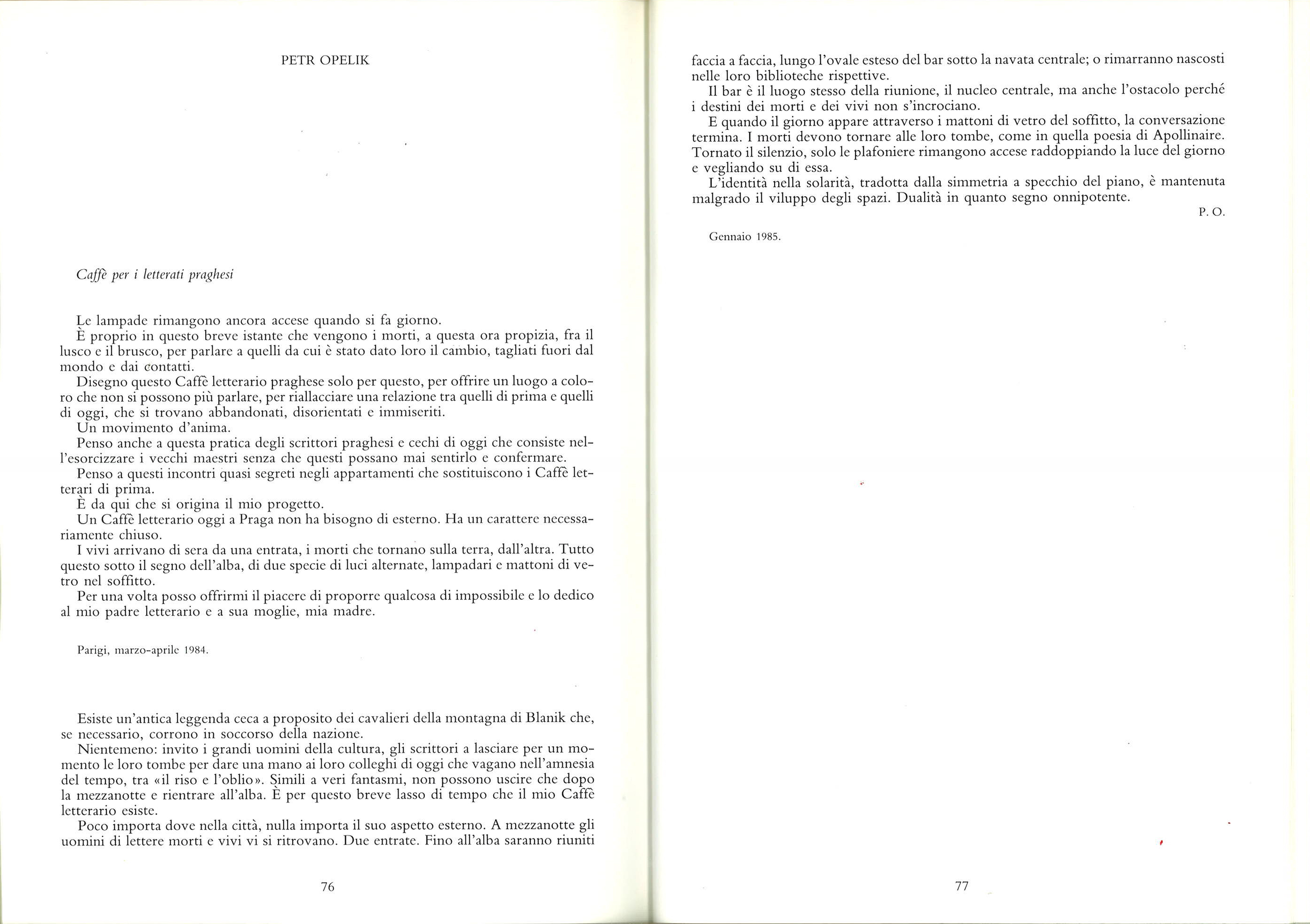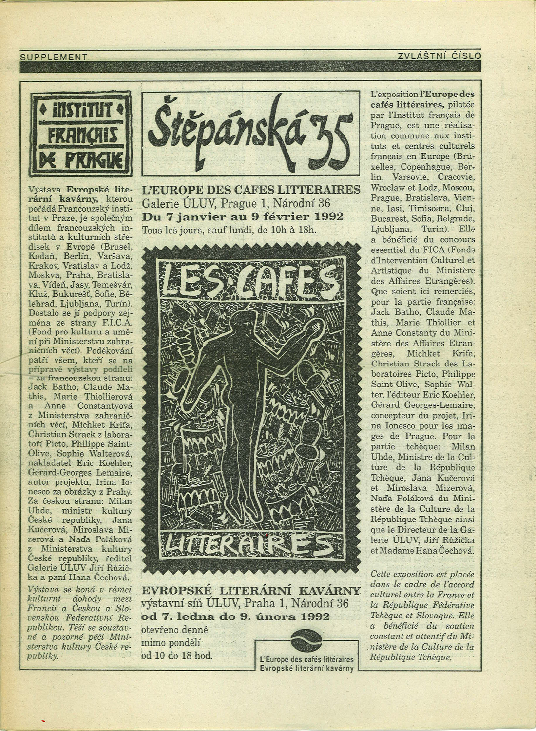 Lorsque j’ai été convié à l’automne 1983 à participer à l’exposition ambulante des ‘Cafés littéraires’, les souvenirs de ce qu’était alors la vie littéraire à Prague des années 1970 contenaient encore toute leur fraîcheur. Je savais que la vie littéraire authentique empruntait depuis le début de la normalisation des voies souterraines et qu’un café littéraire, lieu public par excellence, a déménagé en appartements privés bondés d’écrivains contestataires qui , dans ces réunions périodiques tenues secrètes et dans l’impossibilité de publier librement s’échangeaient, le temps d’un exposé, les points de vue sur les sujets traités. Cela dans le but d’une continuité de réflexion nécessaire pour vaincre la lente mais implacable progression d’amnésie collective se manifestant surtout dans les domaines culturels de la vie publique.